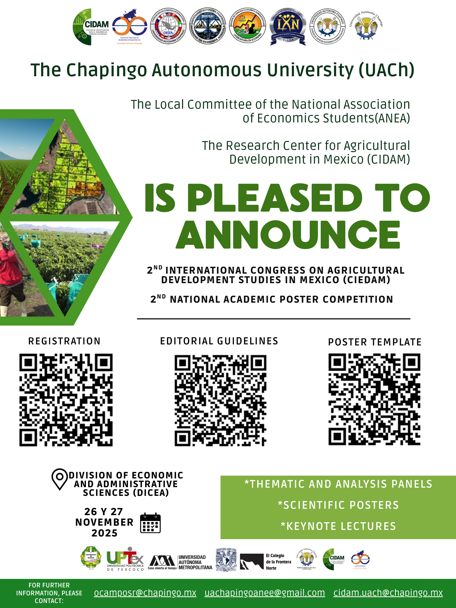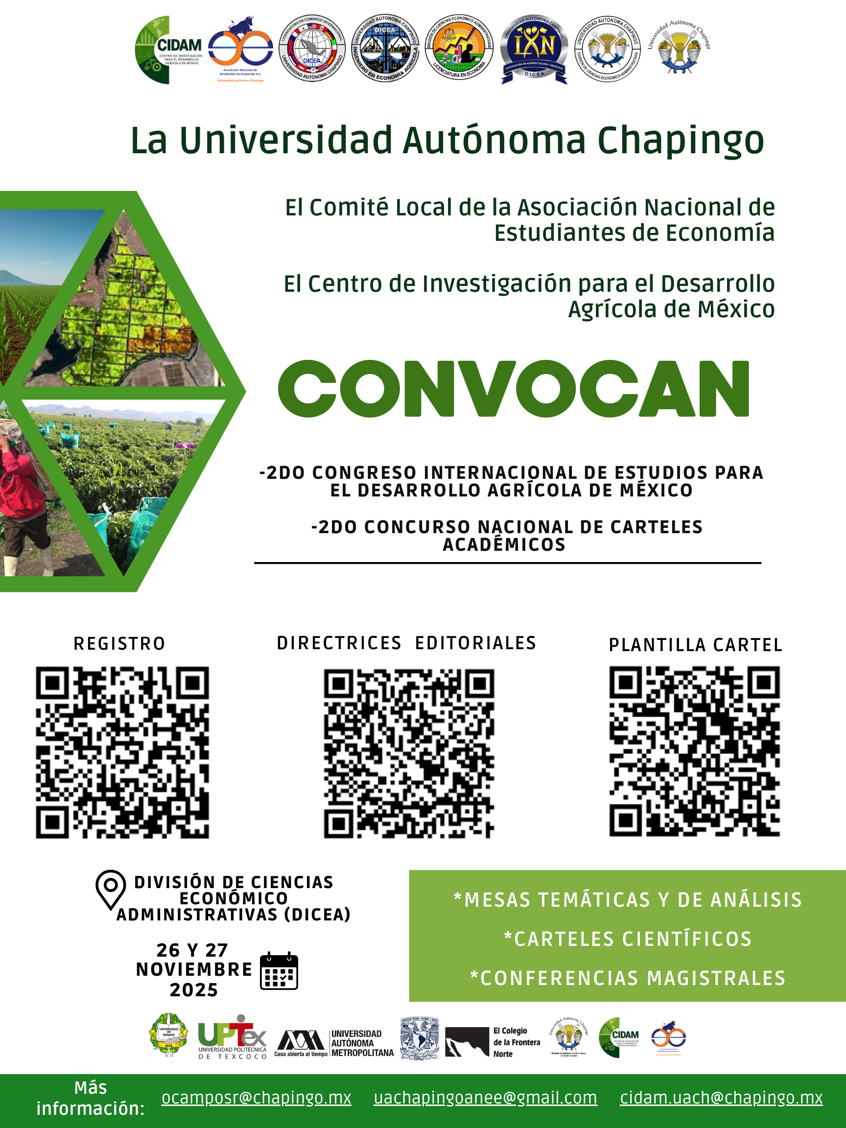 El Centro de Investigación para el Desarrollo Agrícola de México (CIDAM) y el Comité Local de la Universidad Autónoma Chapingo de la Asociación Nacional de studiantes de Economía, en colaboración con las coordinaciones de la Ingeniería en Economía Agrícola y la Licenciatura en Economía, convoca al Segundo Congreso Internacional de Estudios para el Desarrollo Agrícola de México (CIEDAM), al Tercer Seminario Nacional de Estudios para el Desarrollo Agroalimentario de México (SeNEDAM) y al Segundo Concurso Nacional de Carteles Académicos, que tendrán lugar en la División de Ciencias Económico-Administrativas de la Universidad Autónoma Chapingo.